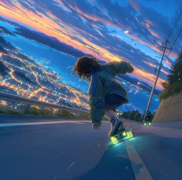 提示词:shinkai makoto style, hyper-realistic anime, a futuristic young woman skateboarding at extremely high speed downhill on a winding mountain road, a breathtaking futuristic cityscape and vast glowing ocean far ahead under a twilight sky with neon auroras, holographic billboards floating in the air, flower petals, glowing wind particles, and drifting light trails, cinematic lighting with dramatic shadows and lens flares, ultra low-angle fixed camera behind the woman, face not visible, camera never pans or cuts, natural skateboarding posture arms spread, knees bent, long hair and futuristic jacket blown wildly by the wind, reflective road surface, glowing edges on her skateboard, sense of immense speed and scale --ar 1:1 --motion low --video 1 (Midjourney)