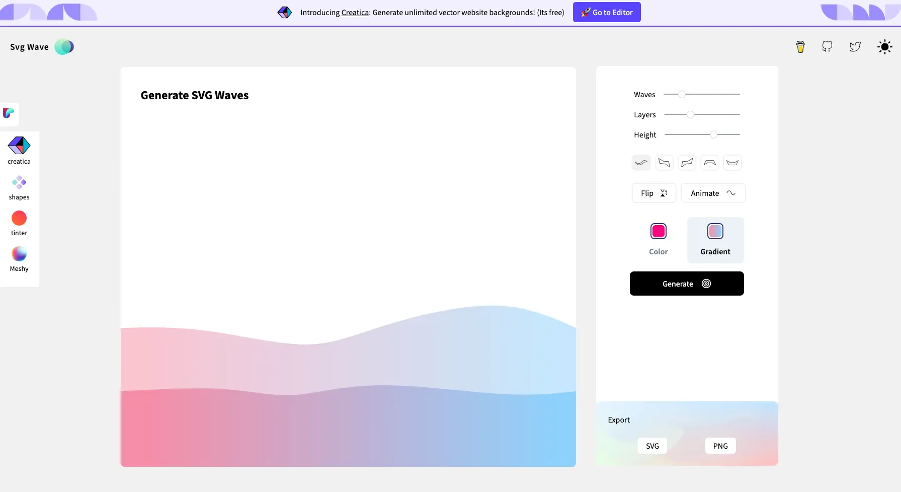 2.Svg Wave - A free & beautiful gradient SVG wave Generator 一款制作波浪图片或 SVG 动画的工具。