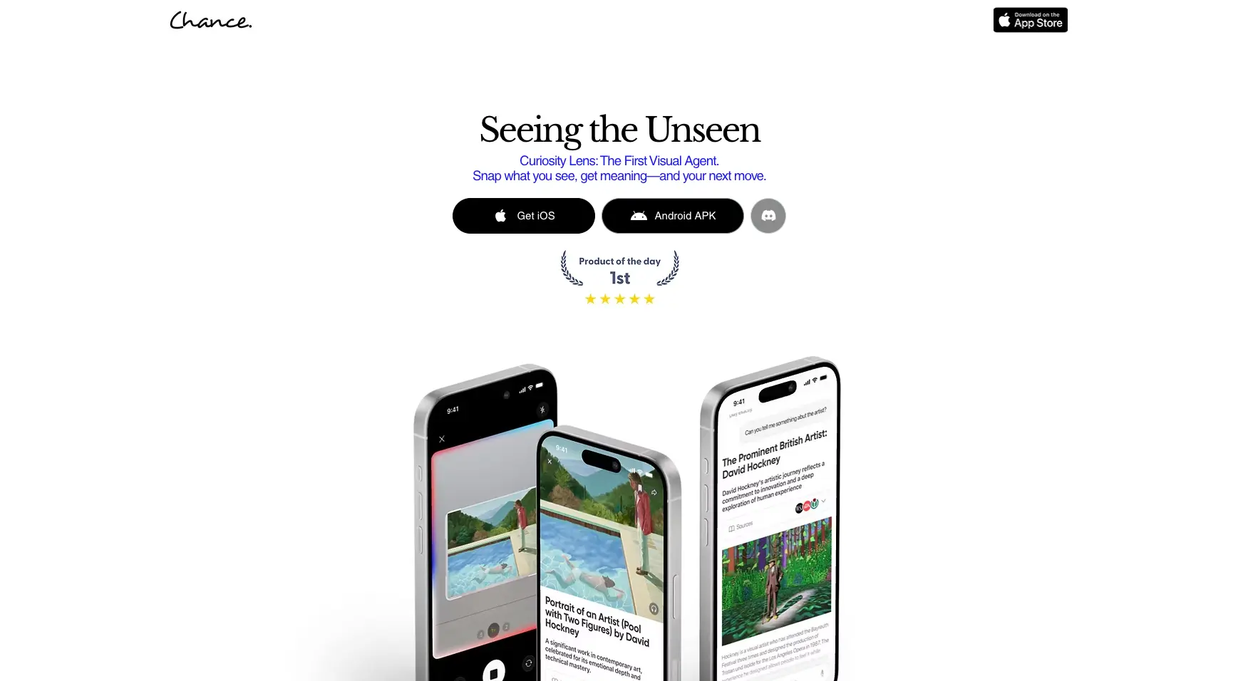 5.Chance AI: Curiosity Lens Chance AI 是一款充满好奇心的人生镜头。对准你的相机,世界便会为你打开——不是广告或噪音,而是意义非凡。我们打造它,是为了在熟悉的事物焕然一新时,点燃那份火花:一栋建筑变成一个故事,一个图案变成一条线索,一个瞬间变成一段记忆。它是第一个帮助你的眼睛思考的视觉媒介——让你看得更深,感受得更近,并将好奇心带入每一天。