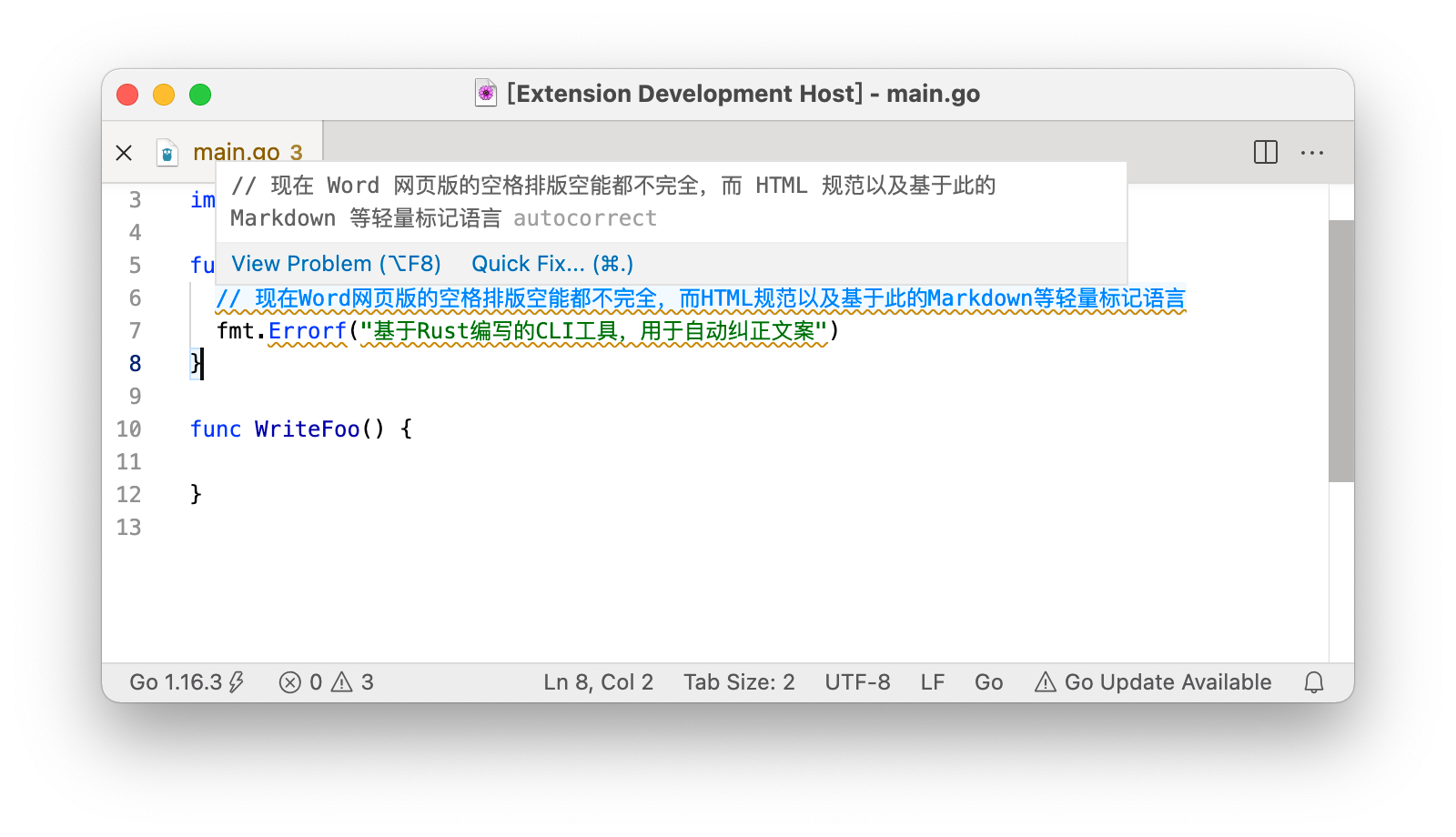 本来最早的时候,只是写了库,用来解决 Ruby, Go, Rust 项目里面使用,后面逐渐发现,深入一点实现,可以搞成一个 fmt 工具,自动处理,加上当前 VS Code 插件的能力,可以搞一个保存的时候自动纠正。